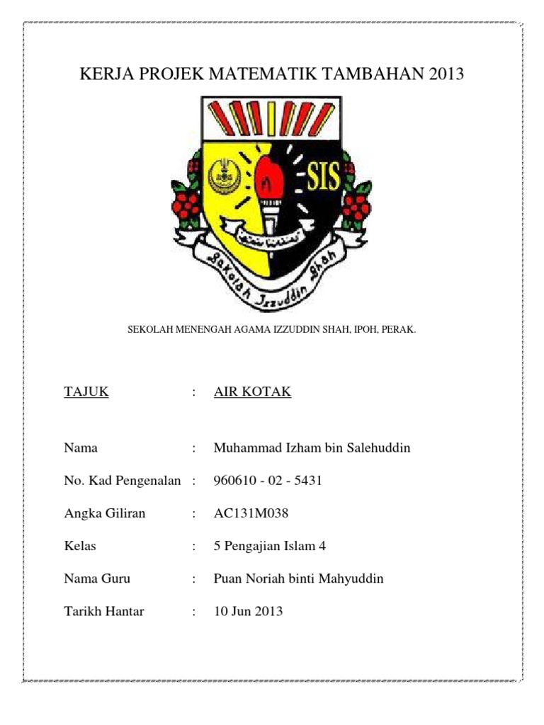 En azmizi bin abdullah isi kandungan. Kerja projek matematik tambahan 2018. Yang mencabar menarik dan bermakna serta seterusnya meningkatkan kemahiran berfikir 2.
