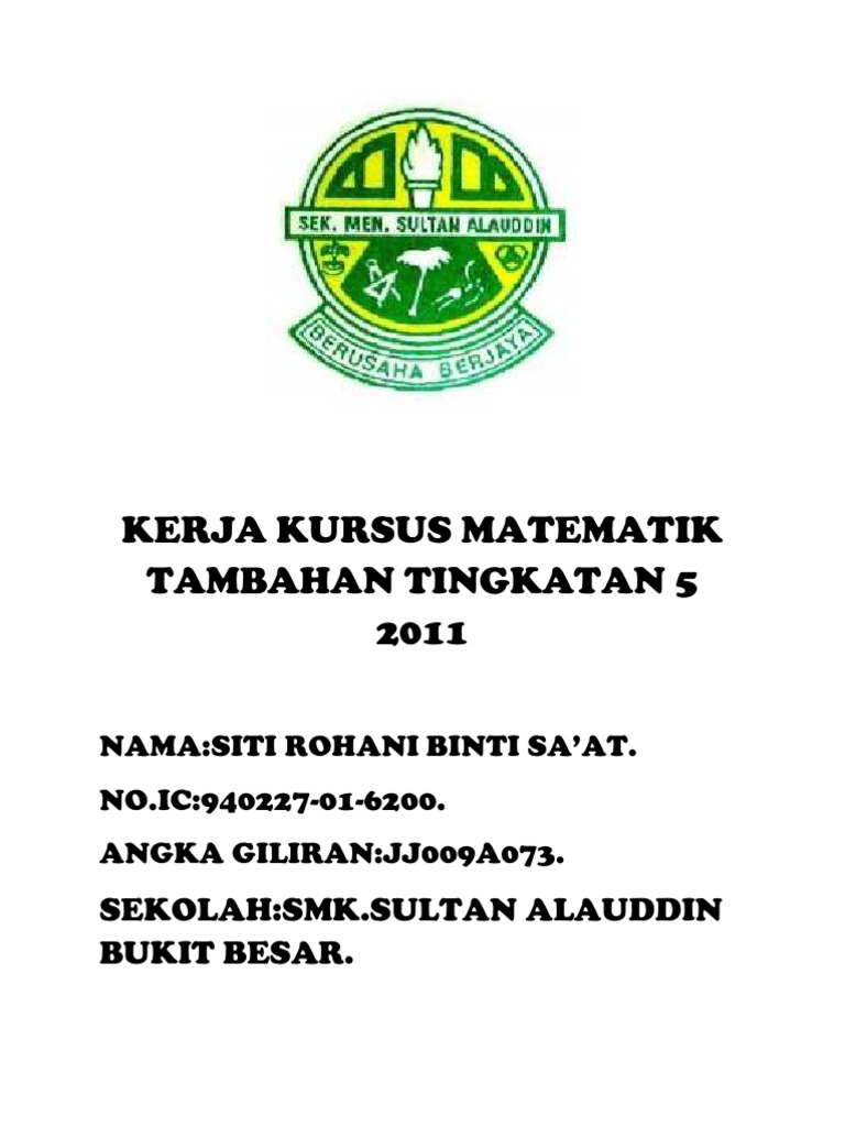 Kerja kursus matematik tambahan tingkatan 5 2011. KERTAS KERJA MATEMATIK TAMBAHAN 2018 SEKOLAH KEBANGSAAN MENENGAH ALOR. Kerja Kursus Add Math - Free download as Word Doc doc PDF File pdf Text File txt or read online for free.